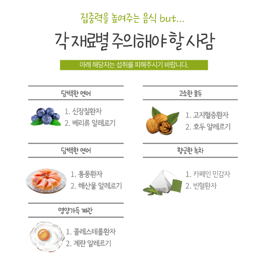 오늘은 일상 식단에 적절히 포함하면 집중력을 높이고 전반적인 뇌 건강향상에 도움되는 음식 재료 TOP5를 추천드립니다 특정 재료는 사람의 체질, 건강상태, 알레르기 등에 따라 섭취를 피해야 하는 경우도 있으니 아래 내용을 끝까지 보시는 것을 추천드립니다